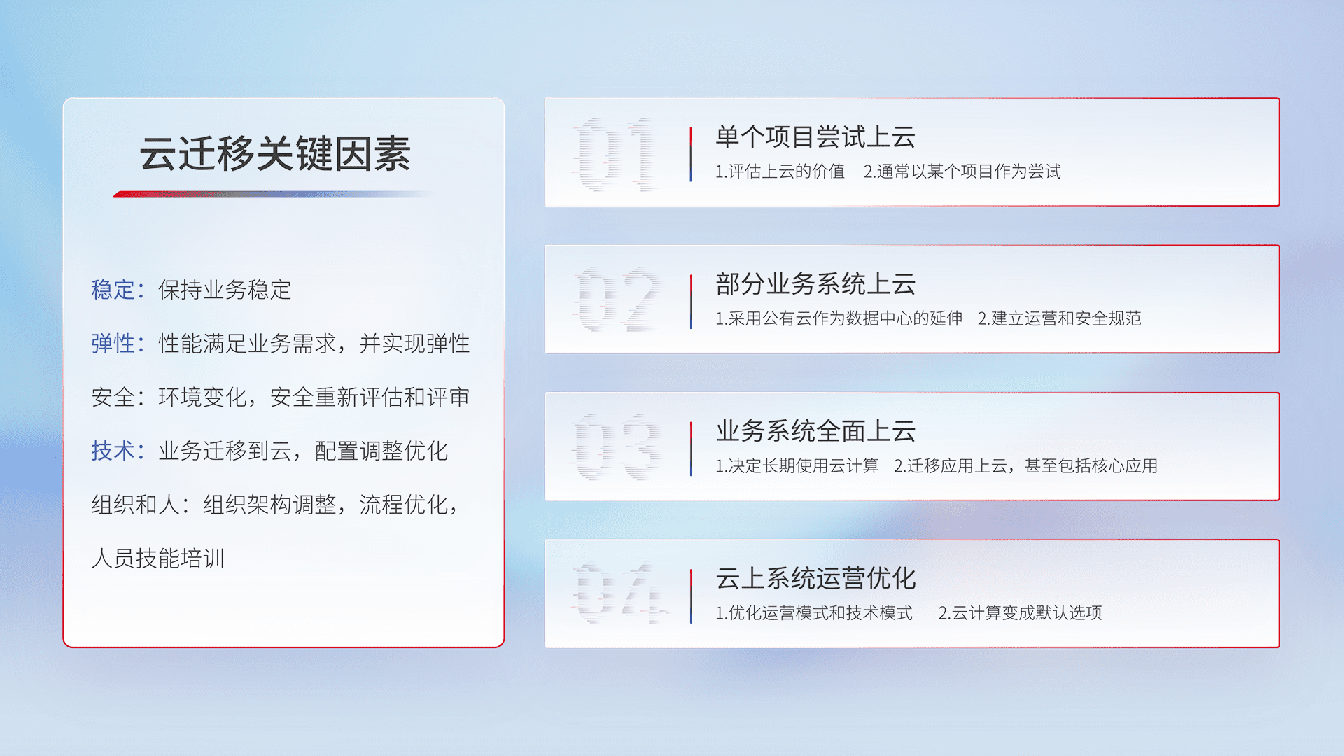 结合实际业务,,从规划设计、、、云平台选型、、、云原生改造、、、、数据迁移、、、、集成交付,,,,迁移全过程为客户识别最佳上云路径,,,做好风险识别管理,,设计网络架构、、身份权限、、、、安全审计合规、、、、操作审计、、日志审计、、监控告警策略、、多站点容灾设计等,,对云上基础设施进行整体规划,,,,提升IT治理水平,,,,以满足弹性、、高可用、、、高性能的需求。。。