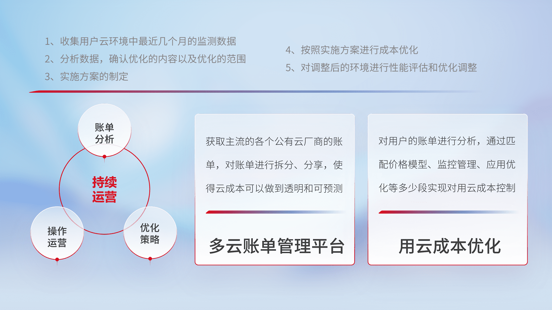 通过多云纳管,,,以统一的资源数据模型把客户的云资源进行抽象和封装,,进而实现对多云资源的统一操作,,,保障云资源管理的可靠性、、、稳定性与可用性。。量身定制化运维内容,,,配置、、、、开发运维、、补丁管理、、、备份、、、监控、、认证和访问管理、、、、审计和日常巡检等,,,,保障在用云过程中的可靠度,,稳定度以及高可用率。。。